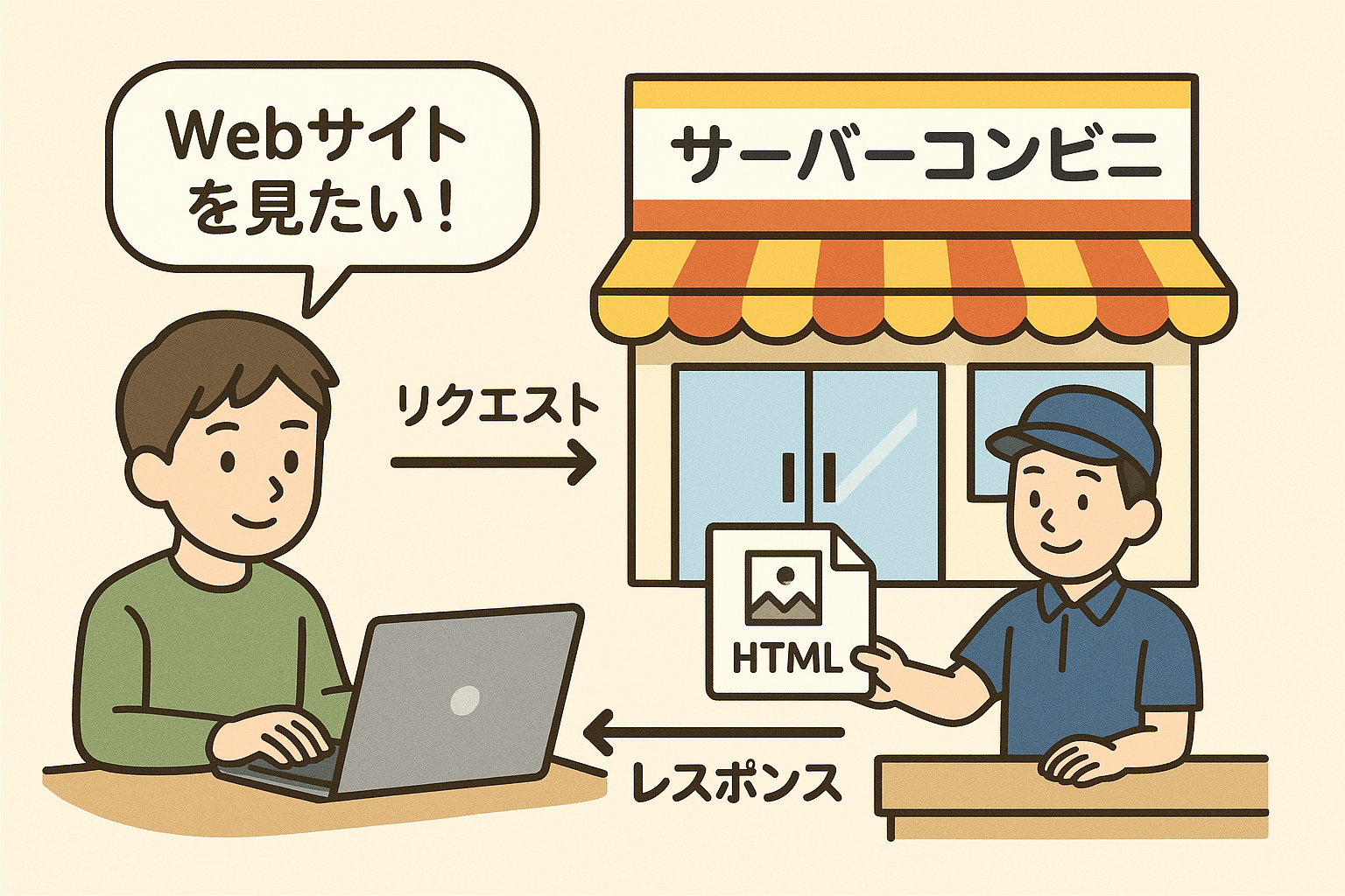 - Webサーバー(コンビニの店員):あなたのリクエストを受け付け、探しているWebページのデータ(商品)を渡してくれる人です。